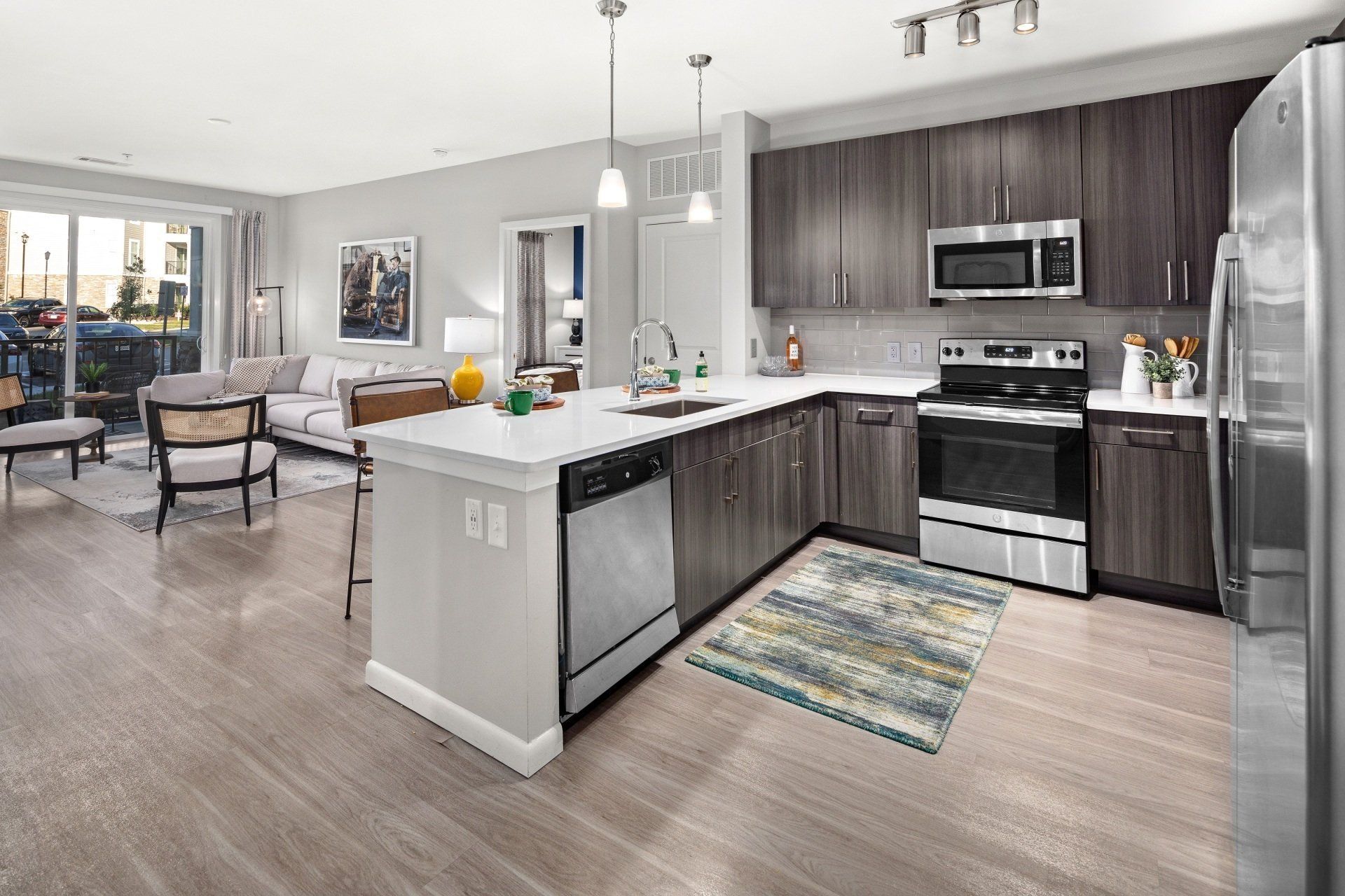 Inside, style and function collide. Spacious walk-in closets, an in-home washer and dryer, and a garden-style bathtub with tile surround are must-haves you didn’t realize you needed. Here, your chef-worthy kitchen, complete with stainless steel appliances, quartz countertops, and a subway tile backsplash, will inspire you to host friends for great meals and good times. Or choose to go solo in the roomy layout of your living area – plank, wood-style flooring greets you at the door.